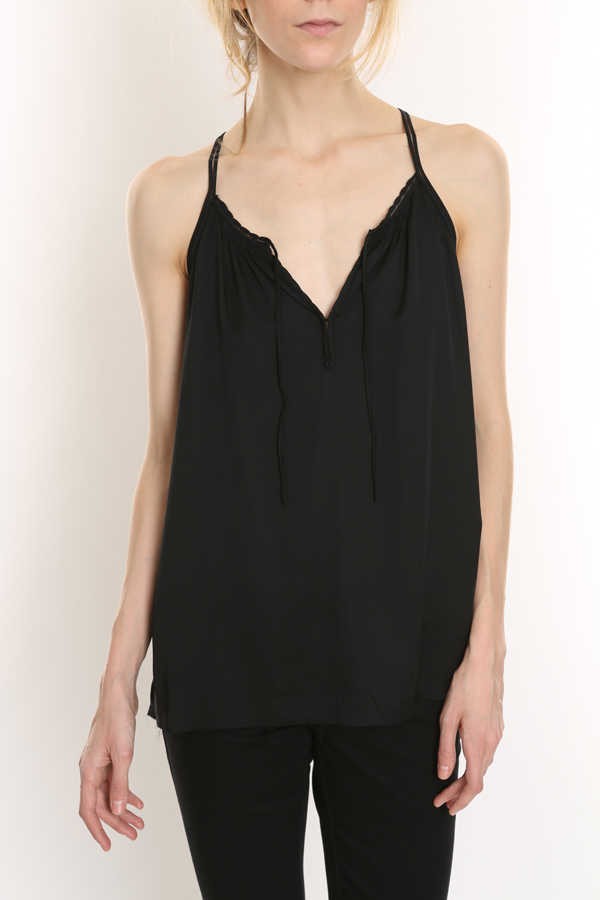 Silk cami. Tie front detail, with hook and eye. Ruched neckline. Loose through the chest and bodice. 100% Silk. Dry clean.